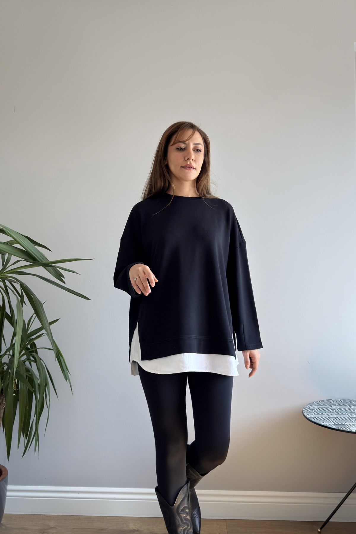 Bu sweat, rahatlığı ve şıklığı bir araya getiren oversize kesimiyle dikkat çekiyor. Alt kısmında yer alan beyaz katmanlı görünüm, kombine modern bir hava katarken basic bir parçayı özgün hale getiriyor. Yumuşak dokusu sayesinde gün boyu konfor sunarken, yan yırtmaç detayları hareket özgürlüğü sağlıyor.