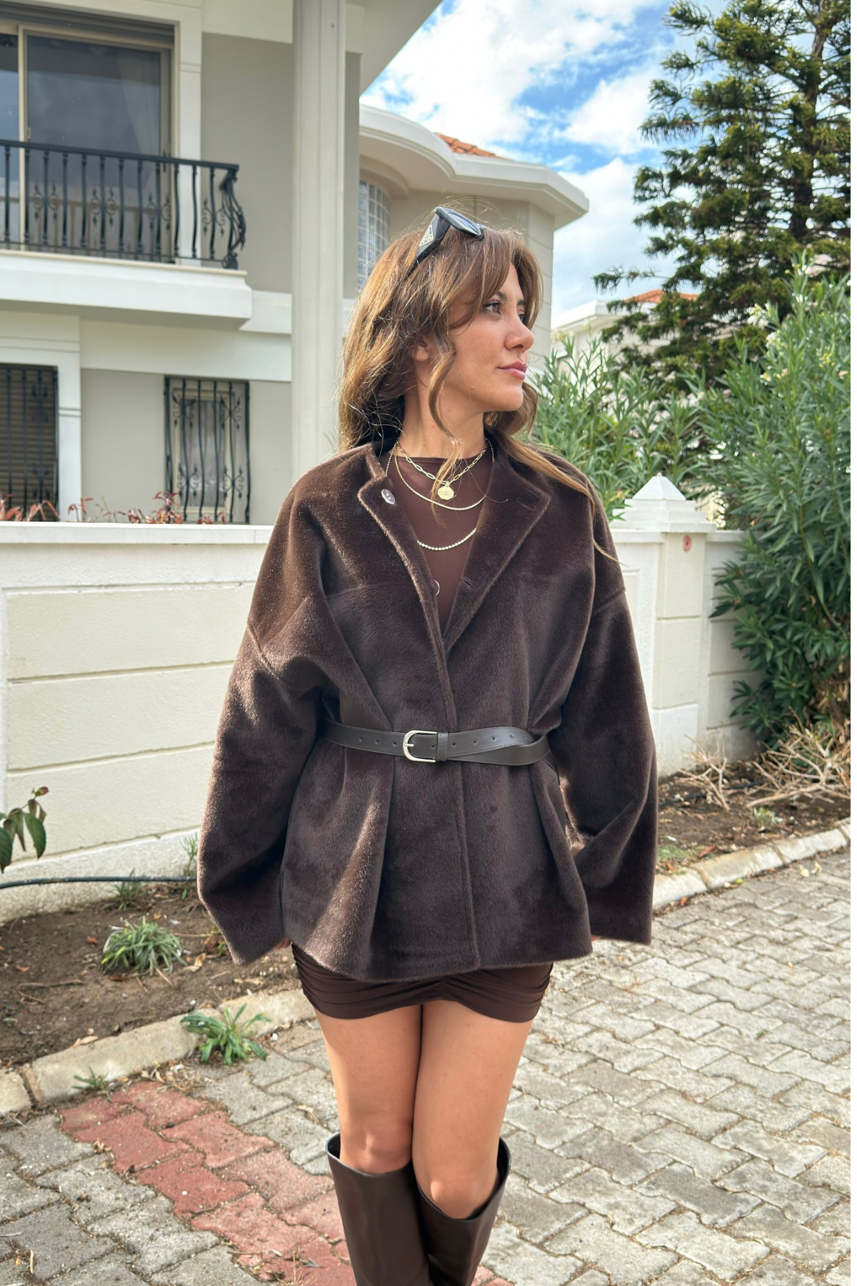 YUVARLAK YAKA KEMERLİ SUNİ KÜRK CEKET
